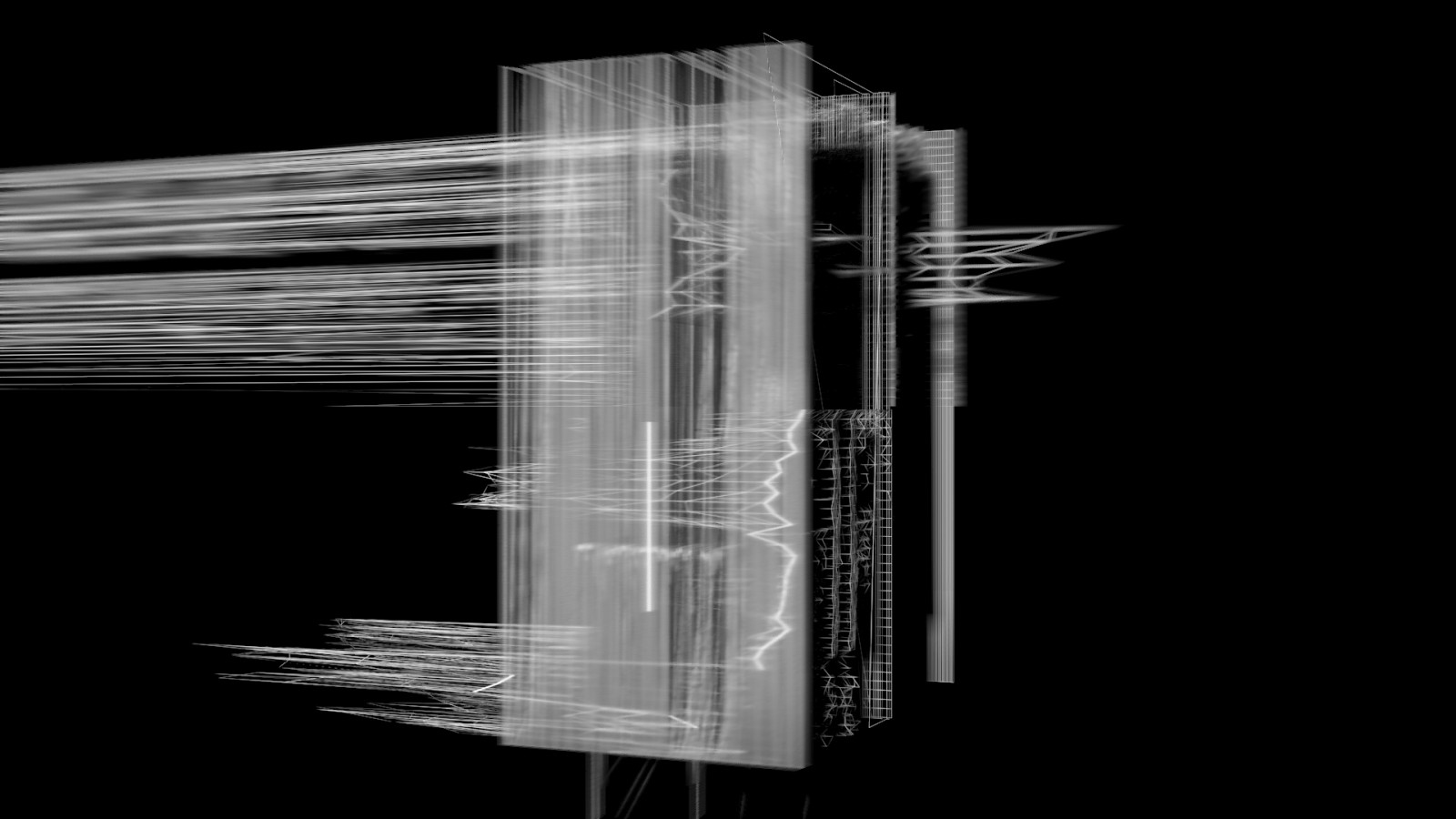 This computer animation shows space refracted by texture and further elaborates it. A tangle of lines creates and changes space. Movement along an unstable construction creates its own narrative, which causes panic because of its utter impermanence. The animation is accompanied by music composed for it.