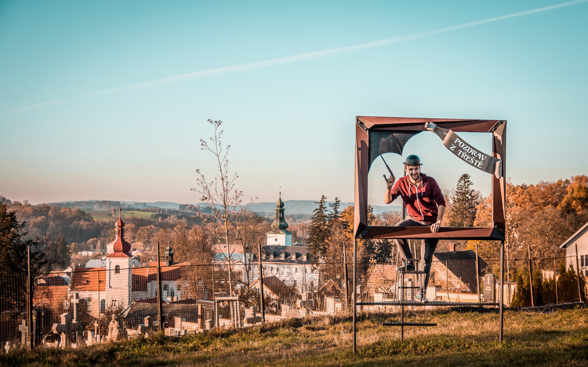 Follow in his footsteps to the "Greeting from Třešť” a giant forged postcard sculpture featuring Mr. Tau’s levitating hat and umbrella, crafted by local blacksmiths and located above the town. From here enjoy panoramic views of Třešť and its iconic three towers.